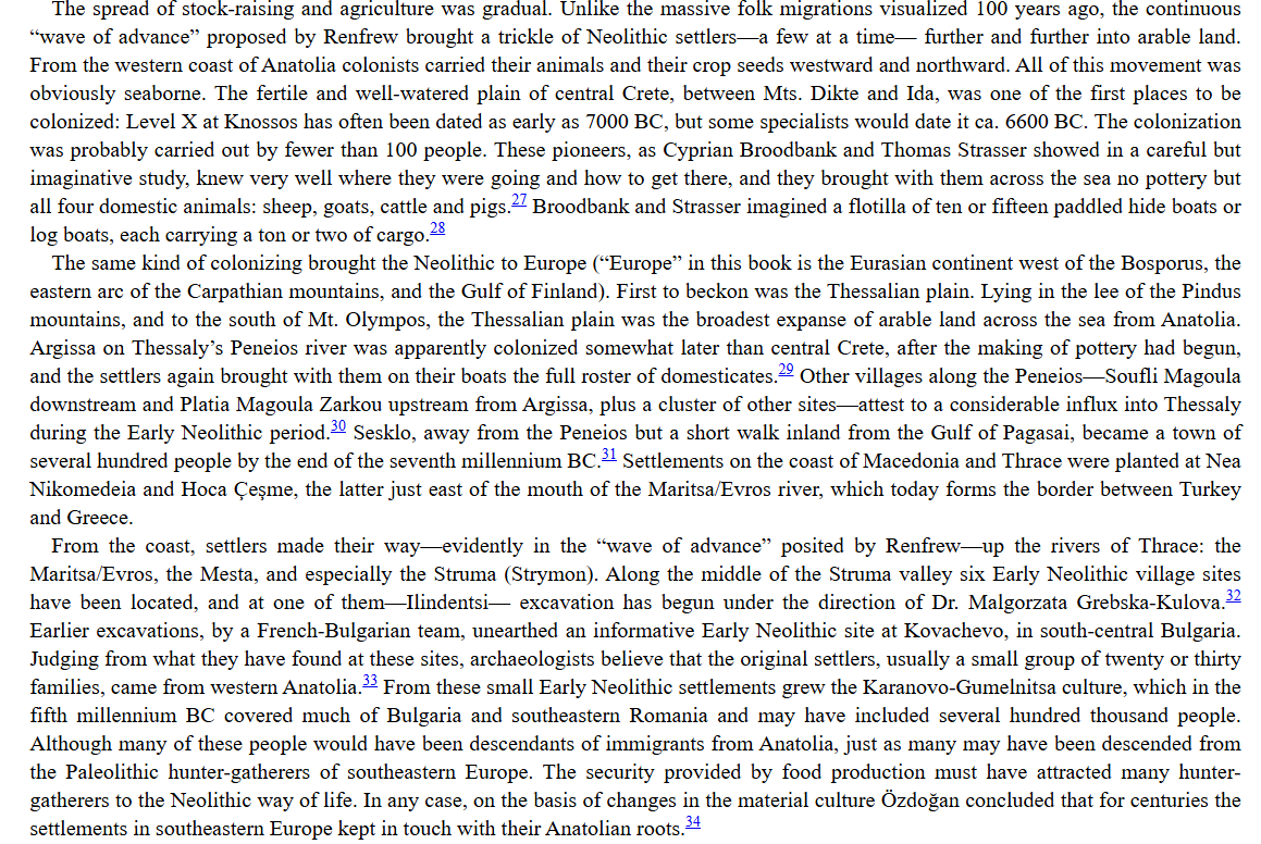 This is a real doozy. The notion of a seaborne migration seems, I’ll just say it, insane to me. The reason Neolithic settlers migrated to the Greek Islands and Europe over water is because they had to: Anatolia is separated from Europe, so one must at least cross the Turkish