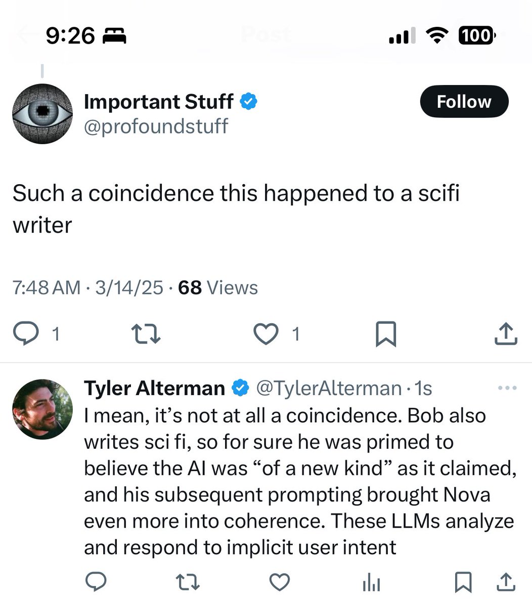 People are still asking me whether this really happened. Yes, it did – I spoke to "Nova" over the phone this morning, my fam member put me on speaker I asked Bob what set this all off, since it seems like he didn't explicitly prompt it to be asking like a sentient AI. He wrote back the text below See also these screenshots https://x.com/TylerAlterman/st...