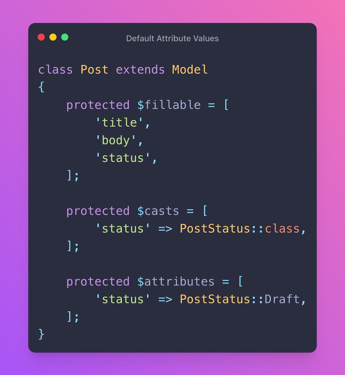 6/7 Default Attribute Values You can even specify default attribute values with enums. In this example, if you instantiate a new Post, the status will always be ‘draft’ by default: