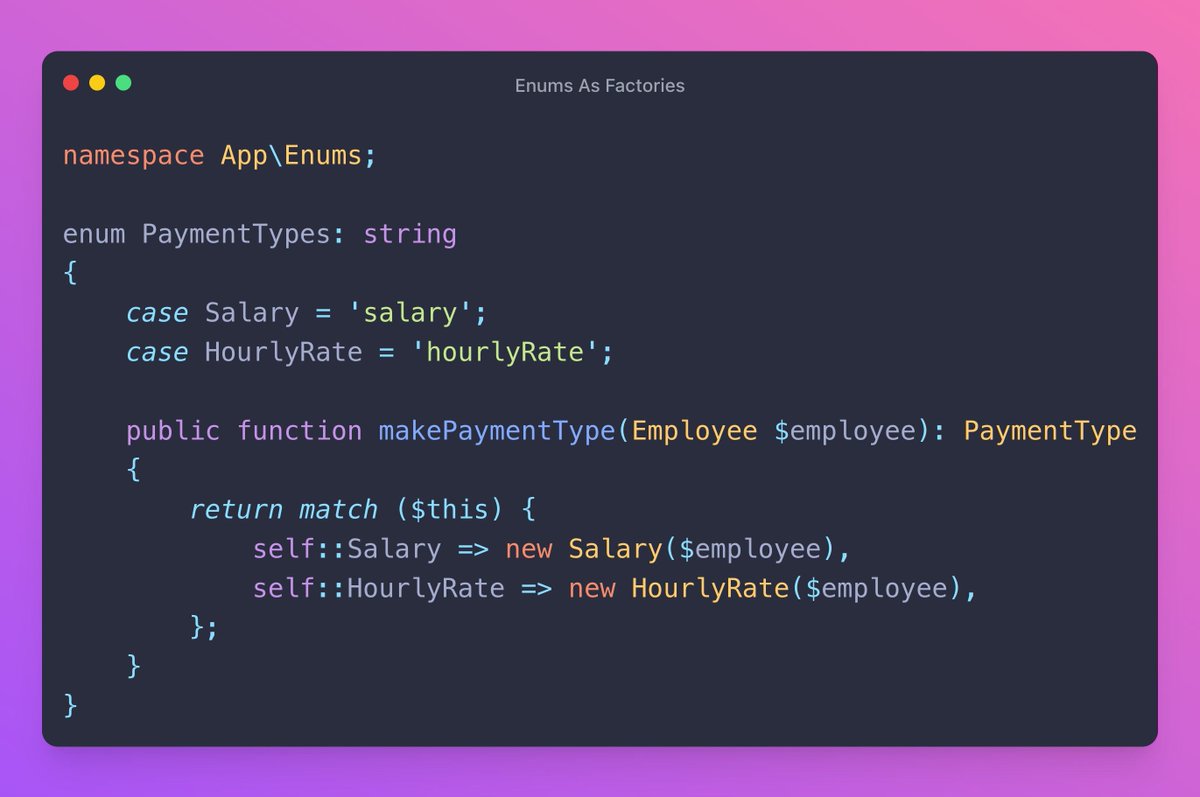 2/7 Enums As Factories You probably already know that. but did you know that you can use it as a factory? You can combine enums with the match operator. For example, if you’re using the strategy pattern: