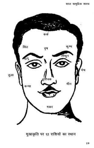 ललाट पर ग्रहों के चिन्ह तथा स्थान १ . सूर्य इसका चिन्ह मध्य बिन्दु युक्त वृत्त का चिन्ह होता है। इसका स्थान दाहिने नेत्र में रहता है। २. चन्द्र धनुष के आकार का इसका चिन्ह होता है। बाएं नेत्र में इसका निवास होता है। ३. मंगल तीन शाखाओं वाला मंगल का चिन्ह सिर के ऊपरी भाग पर दिखाई देता है। ४. बुध एक खड़ी रेखा पर तिरछी रेखा जैसा चिन्ह बुध का होता है। यह मुंह पर वास करता है। ५. गुरु दो के समान चिन्ह गुरु का होता है। इसका निवास दाहिने कान पर होता है। ६. शुक्र धन के चिन्ह के चारों ओर गोलाकार हो ऐसा चिन्ह शुक्र का होता है यह भौहों के बीच में होता है। ७. शनि ईकार के समान इसका चिन्ह होता है इसका निवास बाएं कान पर रहता है। ललाट रेखा फल ऊपर ललाट पर सात रेखाओं का वर्णन पीछे की पंक्तियों में किया जा चुका है। अधिक सूक्ष्मता से विचार करने पर ज्ञात होता है कि दाहिने नेत्र के ऊपरी भाग में छोटी-सी रेखा होती है, वह सूर्य की रेखा कहलाती है। इसी प्रकार बाएं नेत्र के ऊपरी भाग में चन्द्र की रेखा मानी जाती है। भौंहों के बीच में शुक्र की रेखा तथा नासिका के अग्रभाग में विद्वान् लोग बुध की रेखा मानते हैं। १. यदि गुरु रेखा में शाखाएं निकलती हों, तो वह व्यक्ति असत्य भाषी तथा दुष्ट होता है। २. यदि गुरु और मंगल की रेखाएं बीच में टूटी हुई हों, तो उसके पास निरन्तर धन का अभाव रहता है। ३. यदि शनि व मंगल की रेखाएं टूटी हुई हों तथा गुरु की रेखा नीचे की तरफ झुकी हुई हो, तो वह सौभाग्यशाली एवं धनवान होता है। ४. यदि शनि और गुरु की रेखाएं धनुष के आकार की हों, तो वह व्यक्ति दुष्ट स्वभाव वाला होता है।