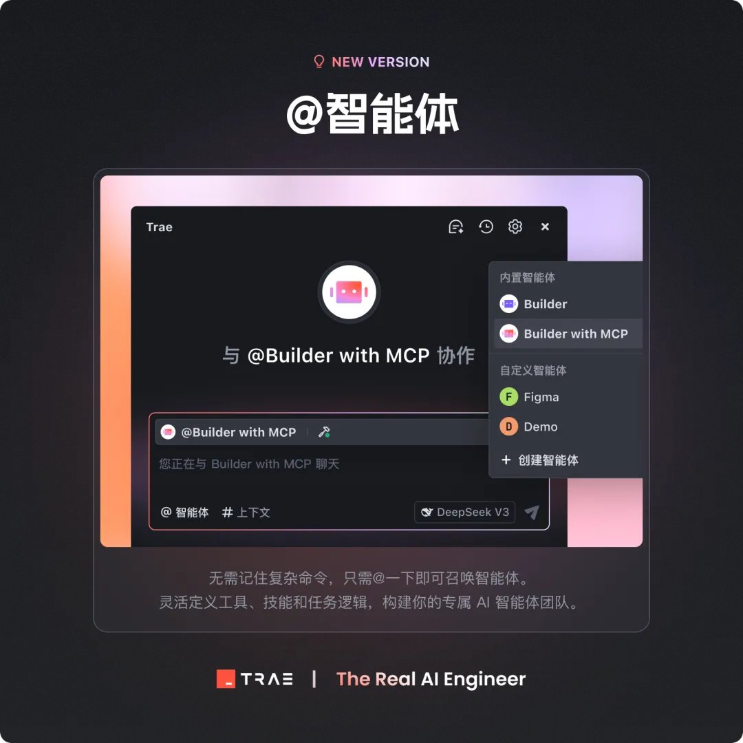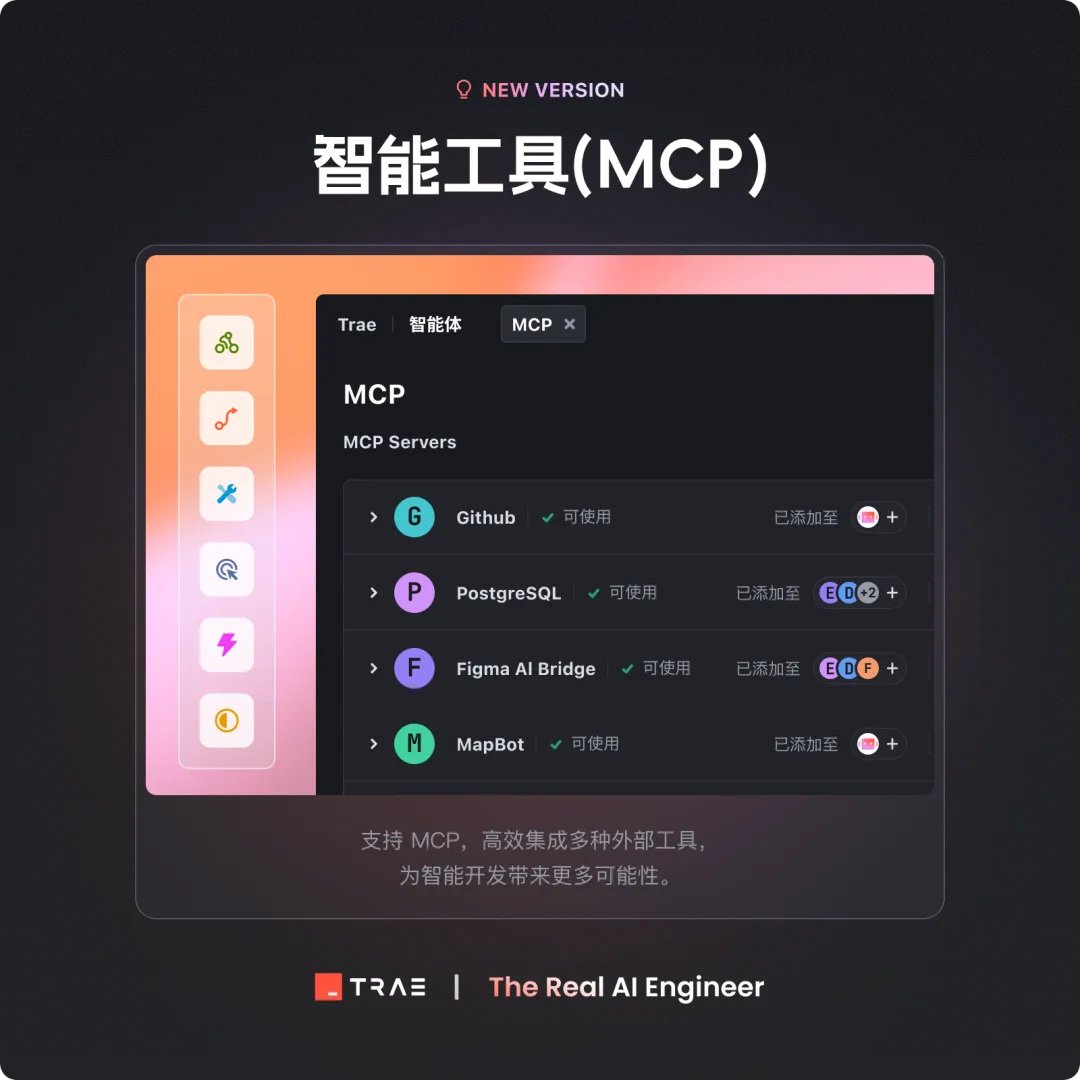 今天字节的 AI 编程工具 Trae 迎来超重磅更新: - 自定义智能体 - MCP - 全局的自定义规则 - 网页和文件作为上下文 四个功能都很强,直接把 Trae 的功能带到了一线 AI 编程工具产品的行列。 特别是自定义智能体+MCP,这是言出法随的新境界。 就着这次更新,我也终于写完了小白入门级 MCP 教程! 👇