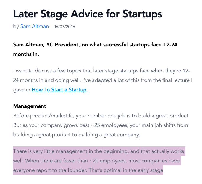 Lesson #3: "Avoid formal management structures until you hit ~25 employees." Sam warns that early-stage startups lose their innovative edge when they introduce management layers too soon. Bureaucracy dilutes the urgency of direct problem-solving.