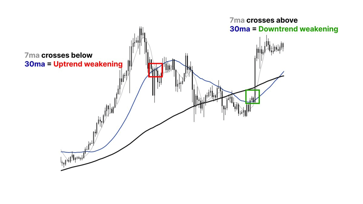 I also use moving averages to anticipate trend reversals to exit trades perfectly. Example: -In uptrends, I look for a 7ma crossing below the 30ma for a trend to flip from bullish to neutral -In downtrends, a 7ma cross above the 30ma means a weakening downtrend.