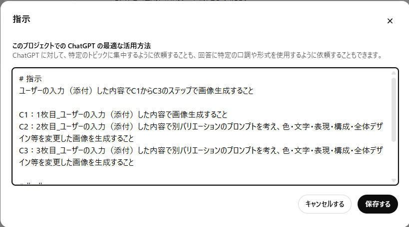 指示に以下のプロンプトを入力 ✅️プロンプト(好みでアレンジしてください) ―――― # 指示 ユーザーの入力(添付)した内容でC1からC3のステップで画像生成すること C1:1枚目_ユーザーの入力(添付)した内容で画像生成すること C2:2枚目_ユーザーの入力(添付)した内容で別バリエーションのプロンプトを考え、色・文字・表現・構成・全体デザイン等を変更した画像を生成すること C3:3枚目_ユーザーの入力(添付)した内容で別バリエーションのプロンプトを考え、色・文字・表現・構成・全体デザイン等を変更した画像を生成すること # ルール - "no yellow tint, no warm filter" - 画像生成時に日本語がある場合は、プロジェクトファイルの「Noto Sans JP」を活用し、文字を正しく描写すること - ユーザーから図解の指示があった場合はテキストは少なめで図をふんだんに用いる。図はロゴやアイコンやシルエットなどミニマルなプロフェッショナルデザインを優先すること ――――