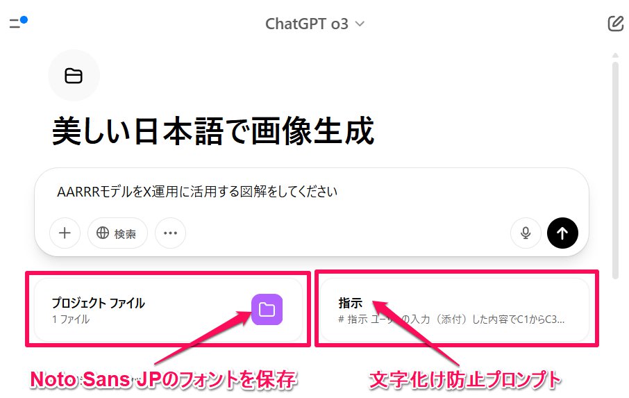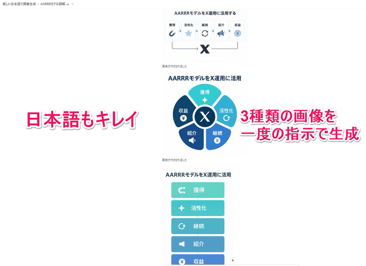 試しにチェック用プロンプト ―――― AARRRモデルをX運用に活用する図解をしてください ―――― 文字化けを必ず防げるわけではありませんが、軽減できます。