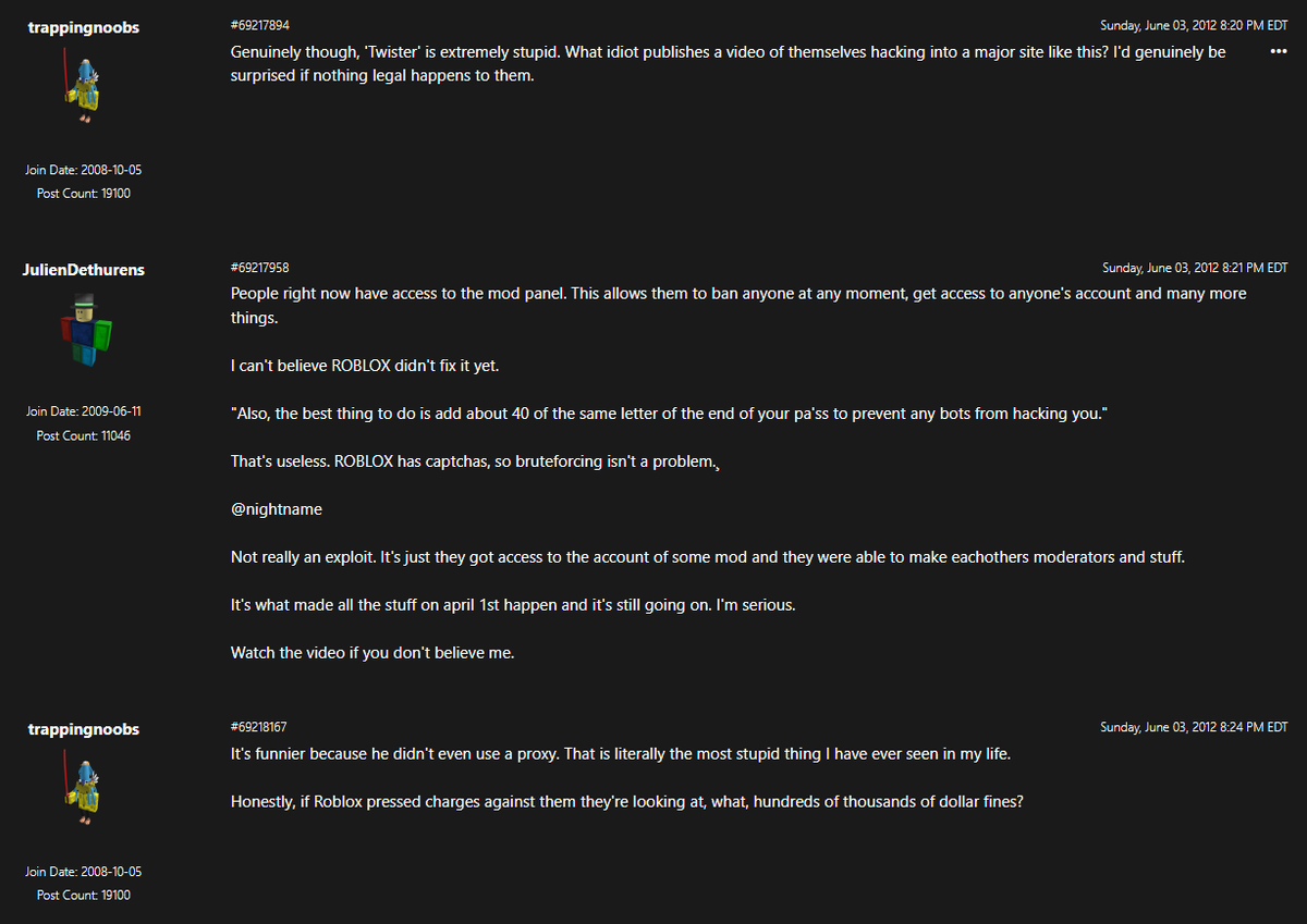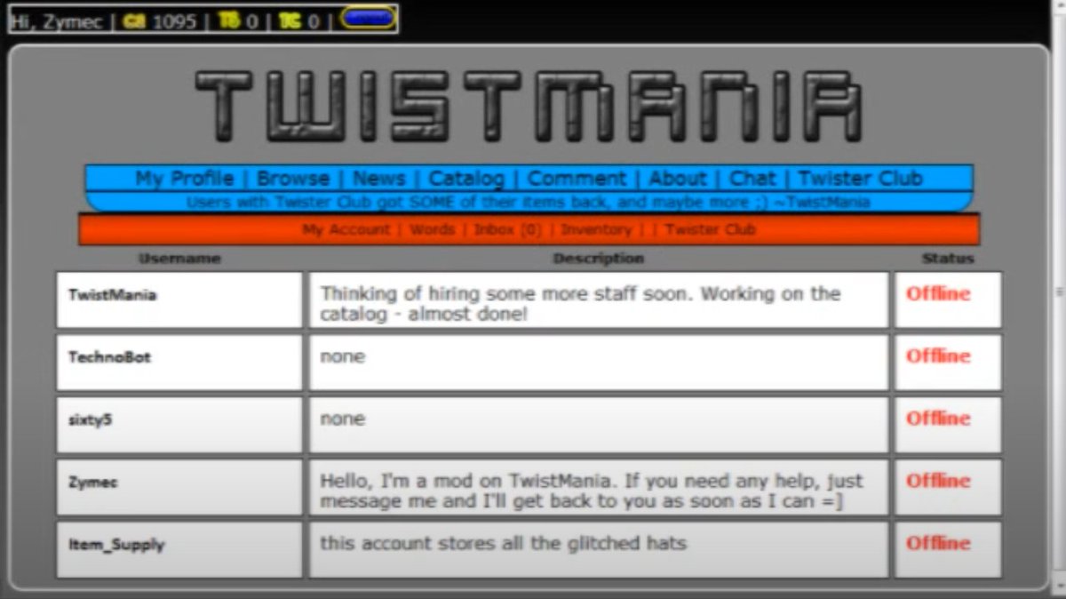 The only other thing Twister may have done was take the 2006 account "Twister" as he has his email attached to it, but that's probably it. Twister would later go on to report the bug to Roblox staff, and seemingly left the exploit alone after that, as far as we know.