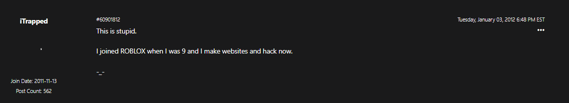 Caleb was a huge bluffer, constantly lying. He has lied about being part of the 4/1/12 hacks He has lied about having admin panel access in 2014 He has lied about having Roblox stock and making PSAs about destroying Roblox. He was just a menace.