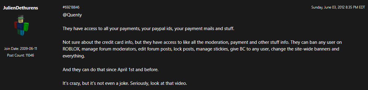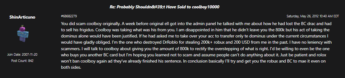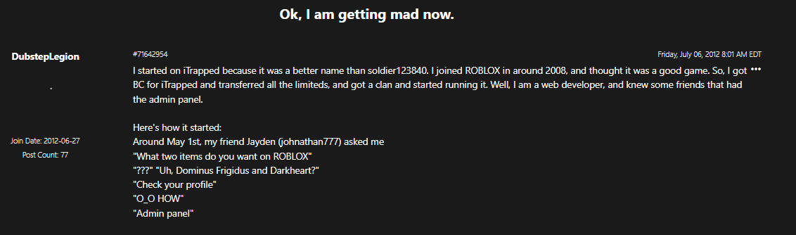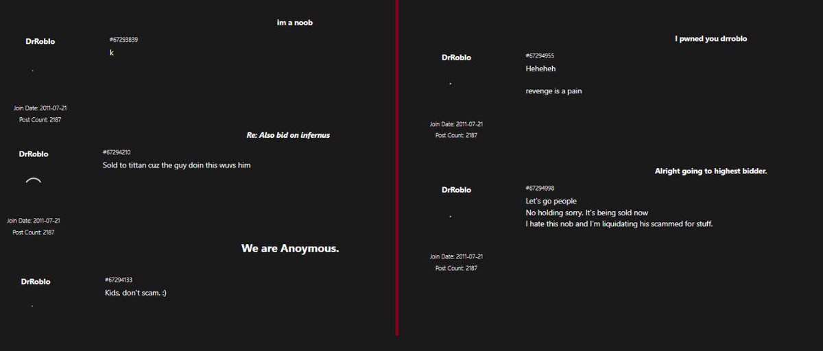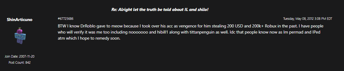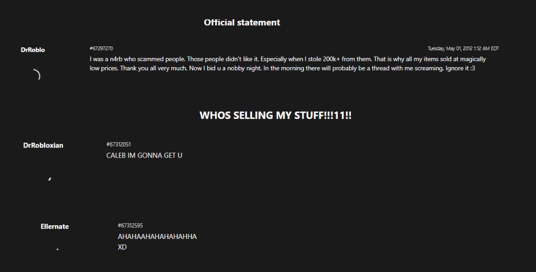 It's also possible the other person(s) who shared Ellernate may have had a play in this, but I can't confirm that. I say this because of the screenshot attached, and, because DrRoblo and DrRobloxian were selling all their items (while hacked) on the forums for hours on end after