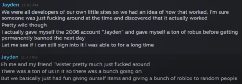 After Ellernate told Vilicus and Twister, the method then was told to Johnathan777 (Jayden) by someone (maybe Twister?). After midnight, similarly to what Twister did, Jayden used the admin panel, and took the 2006 account "Jayden" and began posting on the forums with it later.