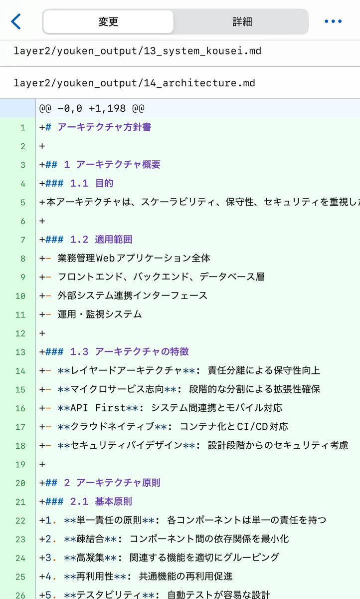 議事録をコミットしたGitHubでClaude CodeのGitHub Actionsを実行したらスマホから要件定義ドキュメントの作成できてた。。。 つまり ・議事録を録音→文字起こし ・GitHubにコミット ・Claude Codeに指示出し ・移動中にGitHub Actionsが動く ・帰社したらドキュメント完成してる がリアルにできる… このリポジトリは「Project as Code」を実現するために用意した上流工程向けリポジトリなのでドキュメントの雛形はすべてコミットしてある。なので、かなりブレ幅なく生成できた。