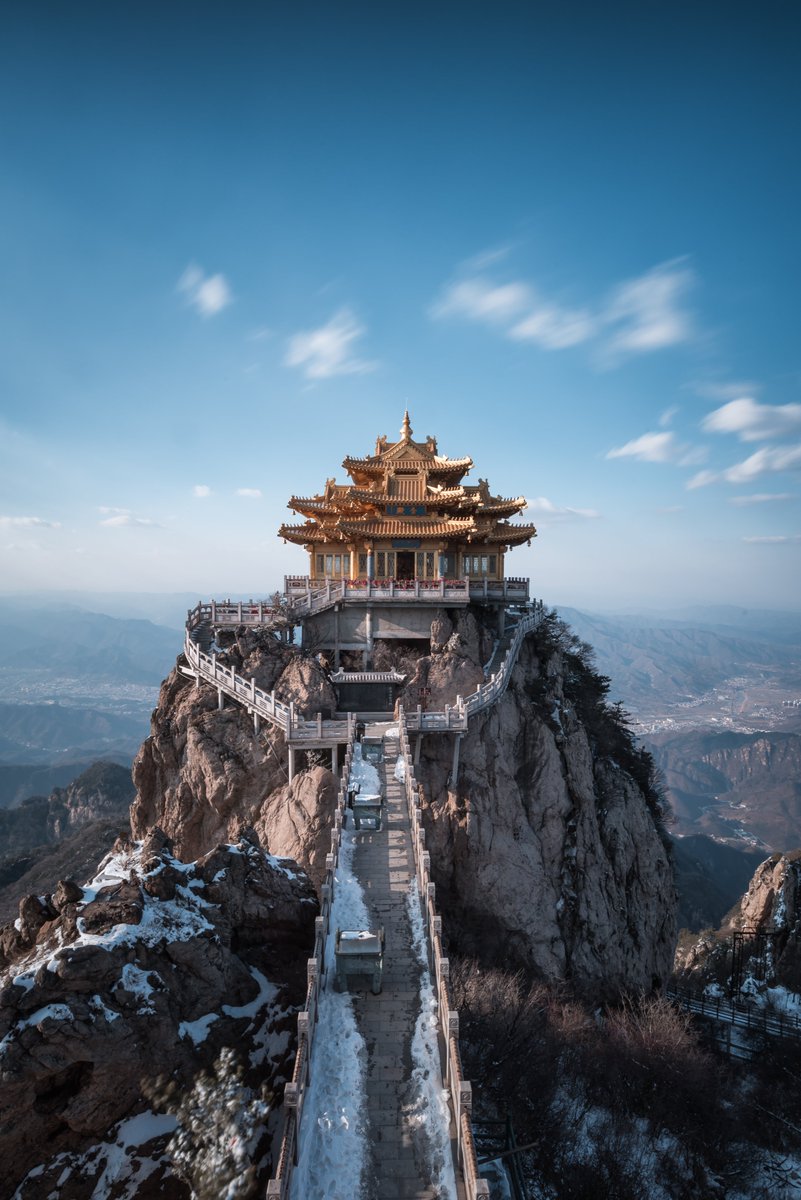 10. Golden Temple of Laojun Mountain, China Its pavilion with a painted golden roof sits atop one of the peaks of Laojun Mountain, the highest in the Funiu Mountains at 2217 meters.
