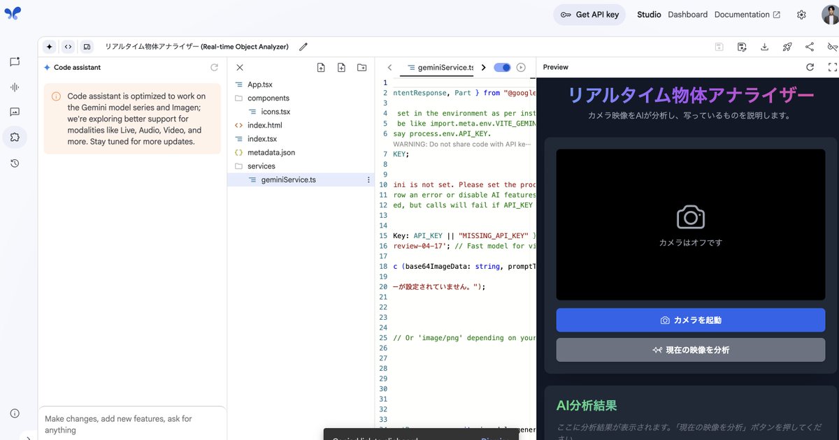 Google AI studioのAIコーディングの精度が高すぎる。 一行のプロンプトだけで自動でAPIも埋め込んだウェブアプリを作れる。今回はカメラで映った物体をリアルタイムで解析。作った後URLで簡単共有が可能。スマホでも起動可能。画像、動画、アプリも作れるGoogle AI Studio最強すぎる。作り方↓