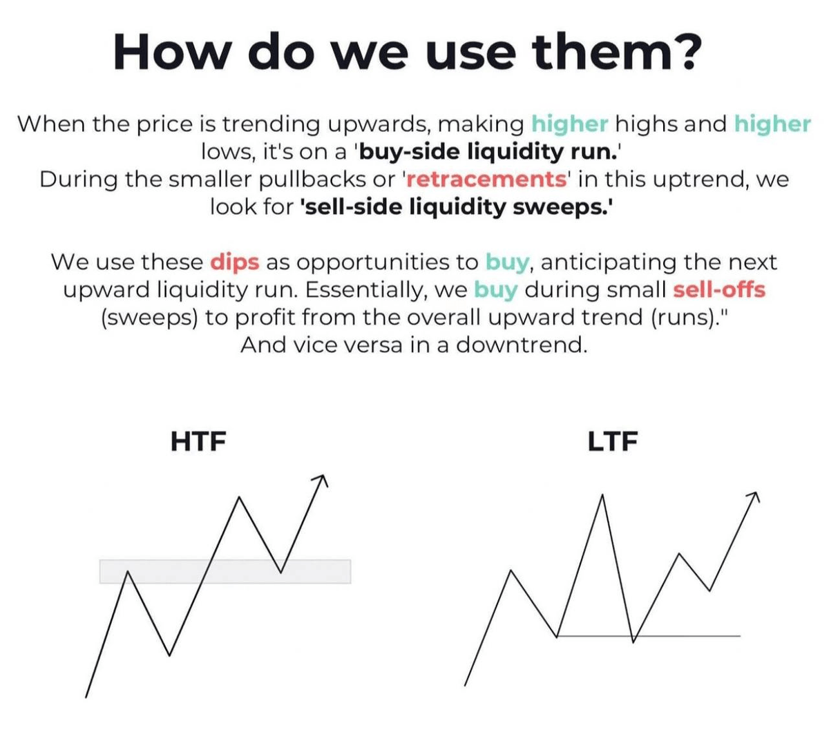 1.3 Liquidity Sweep In a Bullish trend, a Liquidity Sweep is when price dips below a swing low, trapping sellers before reversing up. A Liquidity Run is when price breaks above a Swing High, signaling continuation higher. HTF trends are easier to identify than LTF
