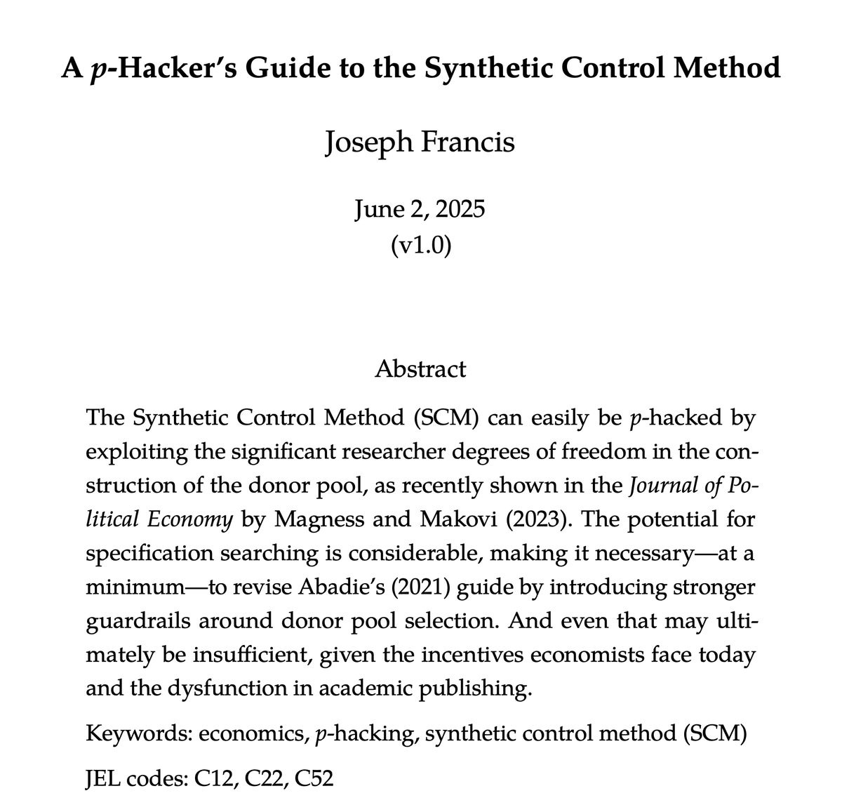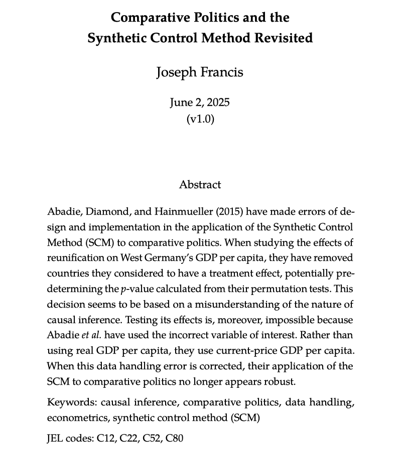 In a second new paper, I then use the case of a recent paper in the Journal of Political Economy to show how the method that ADH use has such researcher degrees of freedom that it is wide open to abuse. https://github.com/joefrancis5... 13/20
