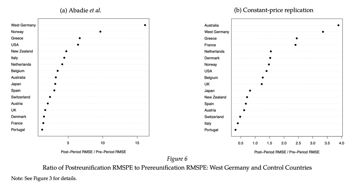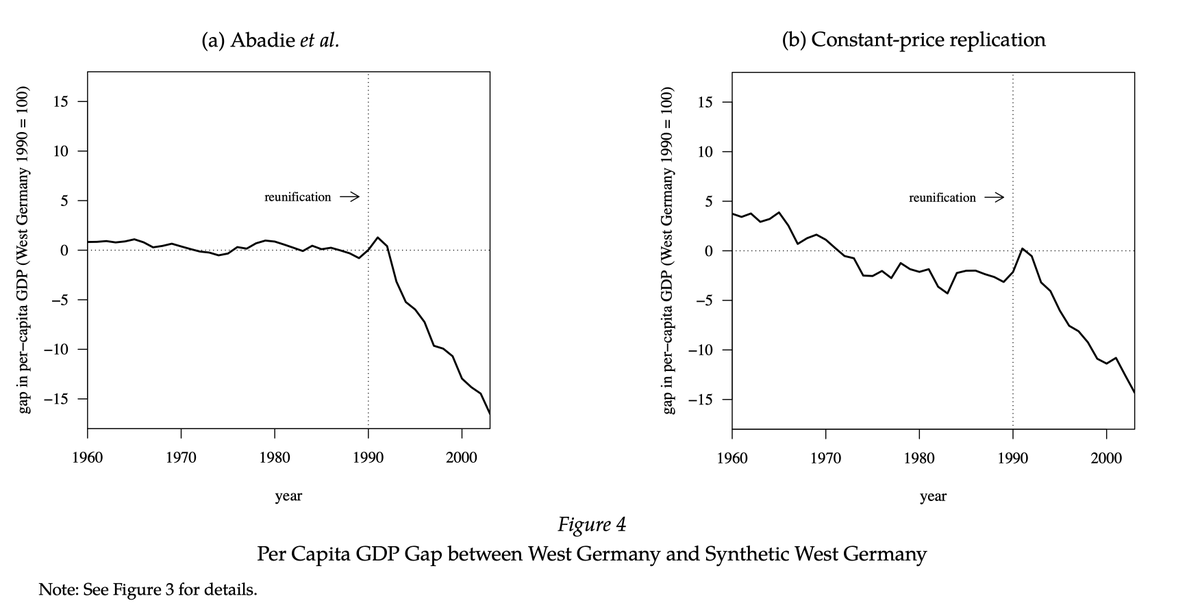 Abadie, Diamond, and Hainmueller (2015) is where the replication crisis comes to economics and political science. Simply put, this chart is impossible. It implies that West Germany’s real GDP per capita grew by almost 8% per year from 1960 to 1990. But it clearly didn’t… 1/20