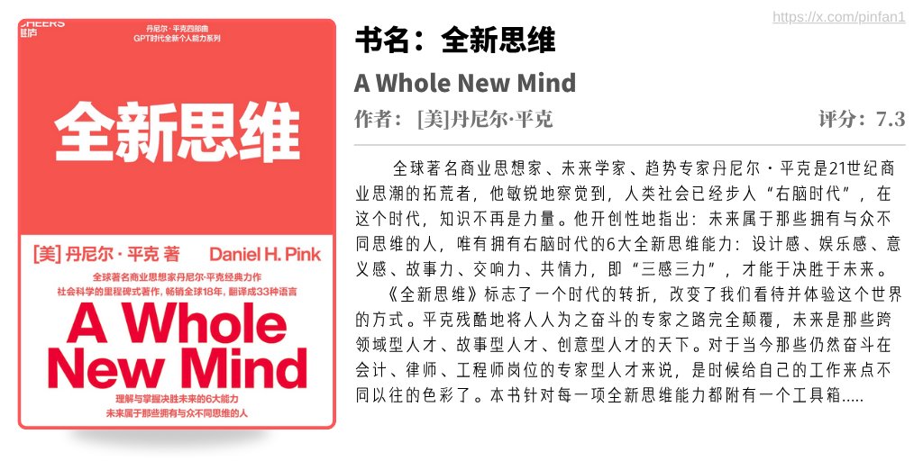 《全新思维》是全球著名商业思想家、未来学家、趋势专家丹尼尔·平克经典著作。本书畅销全球18年,翻译成33种语言 他极具前瞻性地提出,人类社会已经步入“右脑时代”。书中提出6大全新思维能力:设计感、故事力、交响力、共情力、娱乐感和意义感,正是带领我们走上未来之路的关键所在。评论区⬇ #电子书