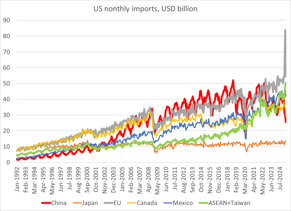 The consumer goods from Asia tariff front running was more subtle than the pharma front running -- it shows up as higher than usual imports from Asia overall in q1 (usually a seasonal low). April saw the first overall fall in imports from the most relevant set of countries 3/