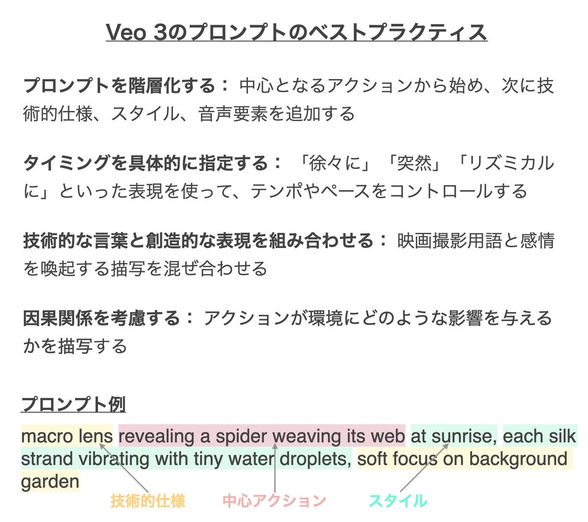 動画生成AI「Veo 3」のプロンプトのベストプラクティスが出た。 ポイント: 1. プロンプトを階層化する 2. タイミングを具体的に指定する 3. 技術的な言葉と創造的な表現を組み合わせる 4. 因果関係を考慮する 重要なのは、技術的・創造的指示を組み合わせ、映像の具体性と芸術性の両方を高めること。