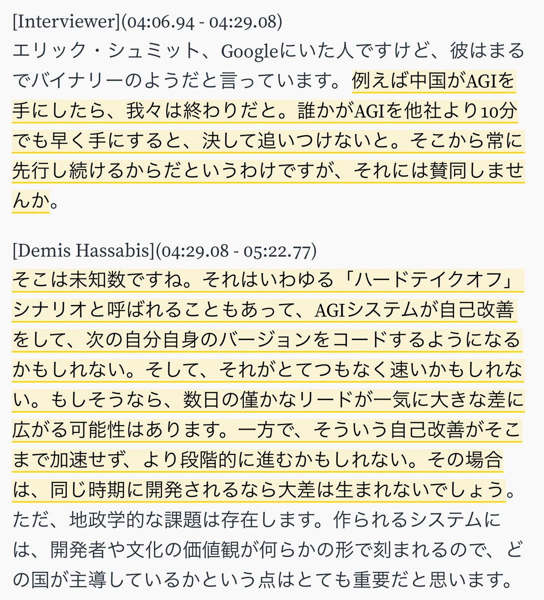 デミス・ハサビス: ・AGI登場が段階的な移行になるのか、急激な変化になるのかはまだはっきりしない ・私の予想では、どちらかというと段階的な移行に近いと思う