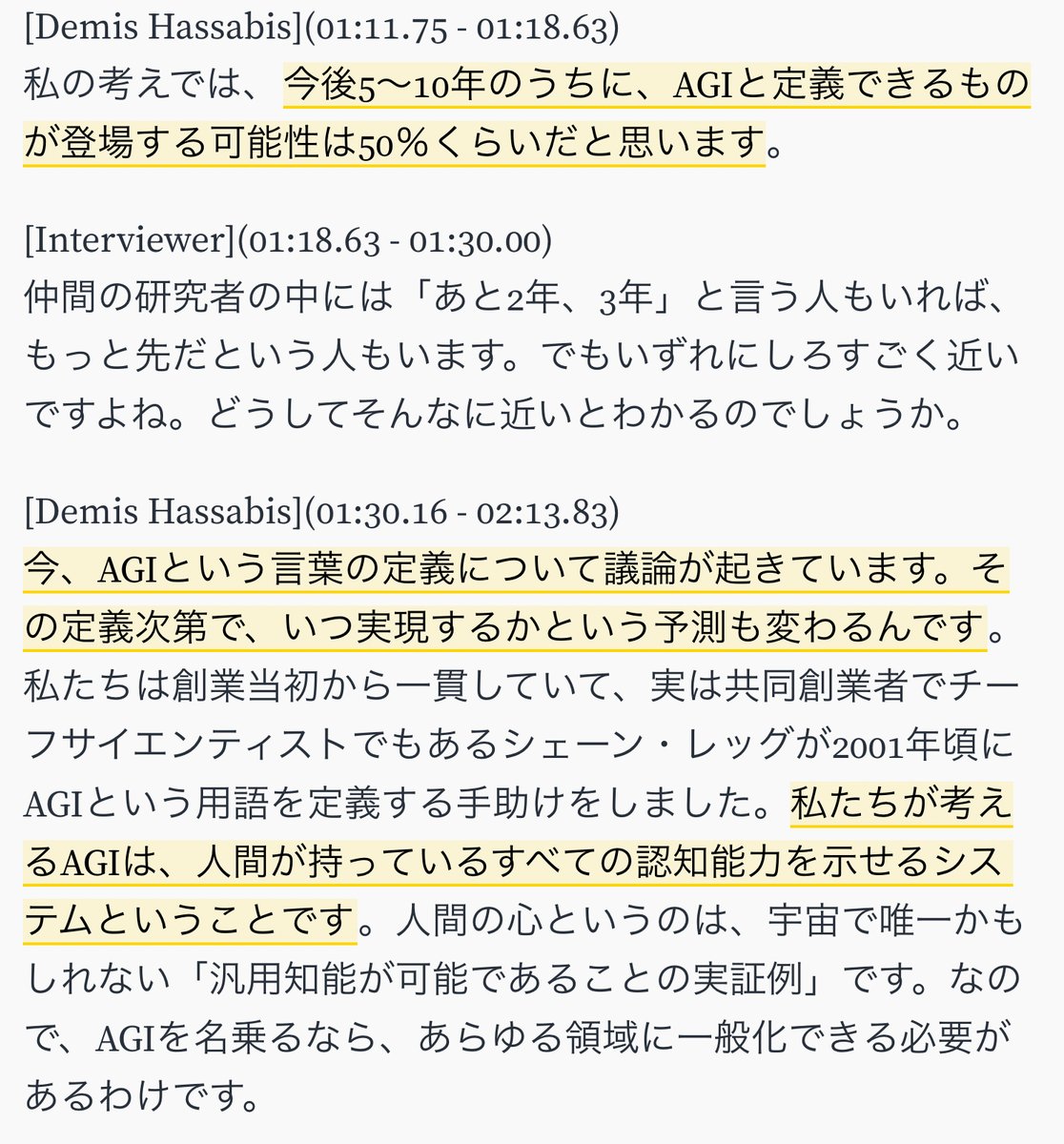 デミス・ハサビス: ・今後5〜10年のうちに、AGIと定義できるものが登場する可能性は50%くらい ・AGIの定義次第で、いつ実現するかという予測も変わる ・私たちが考えるAGIは、人間が持っているすべての認知能力を示せるシステム