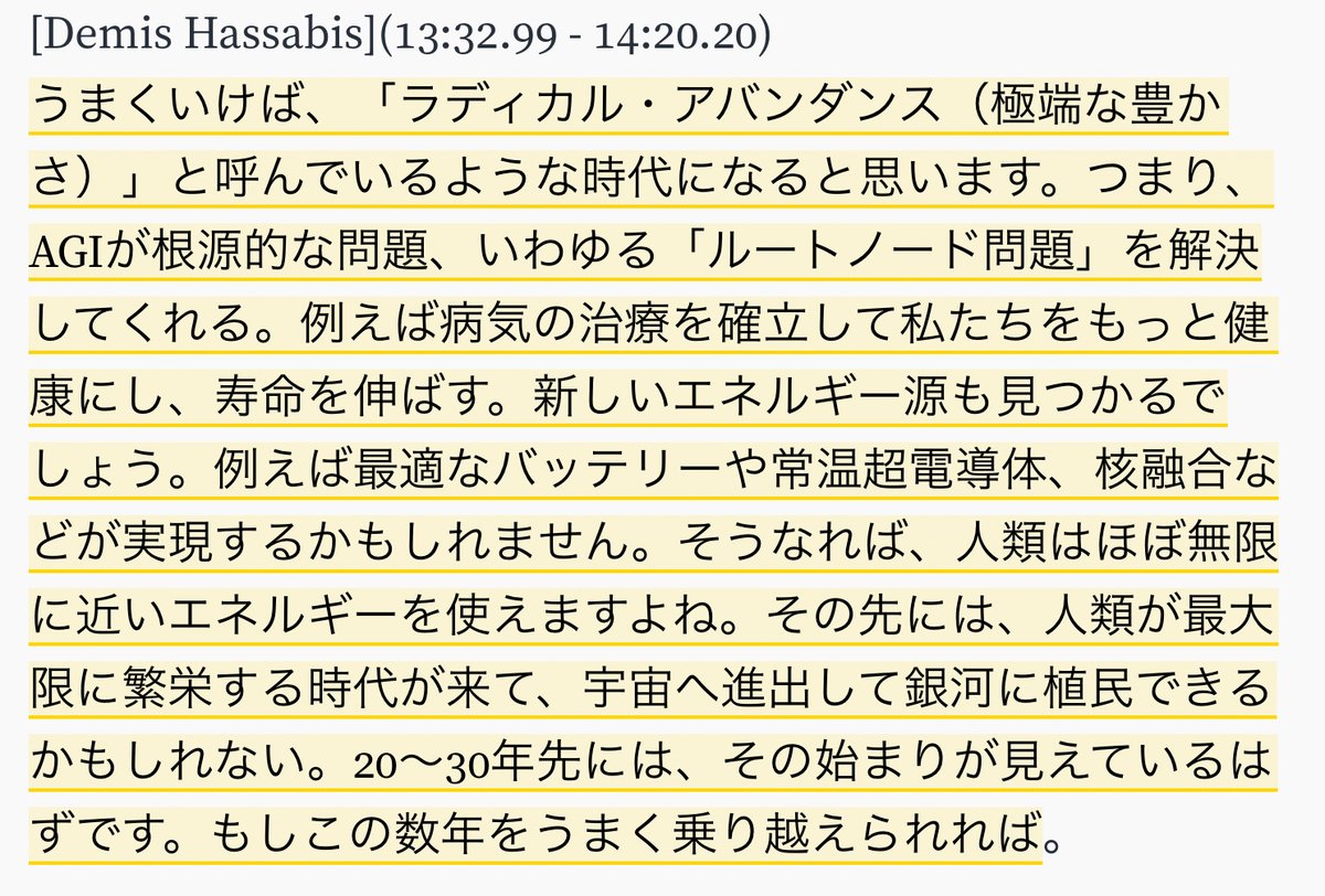 デミス・ハサビス: ・うまくいけば、「ラディカル・アバンダンス(根本的な豊かさ)」と呼んでいるような時代になる ・AGIが根源的な問題、いわゆる「ルートノード問題」を解決してくれる ・例えば病気の治療を確立して私たちをもっと健康にし、寿命を伸ばす ・新しいエネルギー源も見つかる