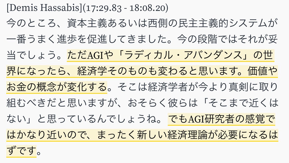 デミス・ハサビス: ・AGIや「ラディカル・アバンダンス」の世界になったら、経済学そのものも変わる ・価値やお金の概念が変化する ・AGI研究者の感覚ではその時はかなり近い ・まったく新しい経済理論が必要になるはず
