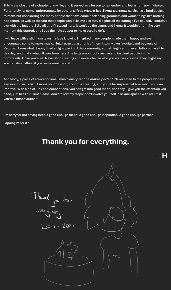 @evenin_arcadia thank you for coming out and saying all of this. as a person who has genuinely looked up to you and many other musicians, i'm very glad you're stepping away and pushing yourself forward in life. take care sandi. thanks for being one of my biggest inspirations. 💚