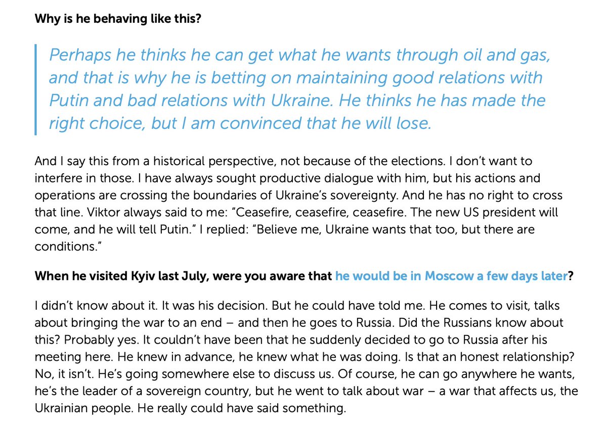 ⚡️“His policy is, unfortunately, anti-Ukrainian. And anti-European. He is using this in his domestic policy: he wants to turn the war in Ukraine to his own advantage in the elections. That is dishonest”, Volodymyr Zelenskyy tells Válasz Online about Orbán. https://www.valaszonline.hu/20...