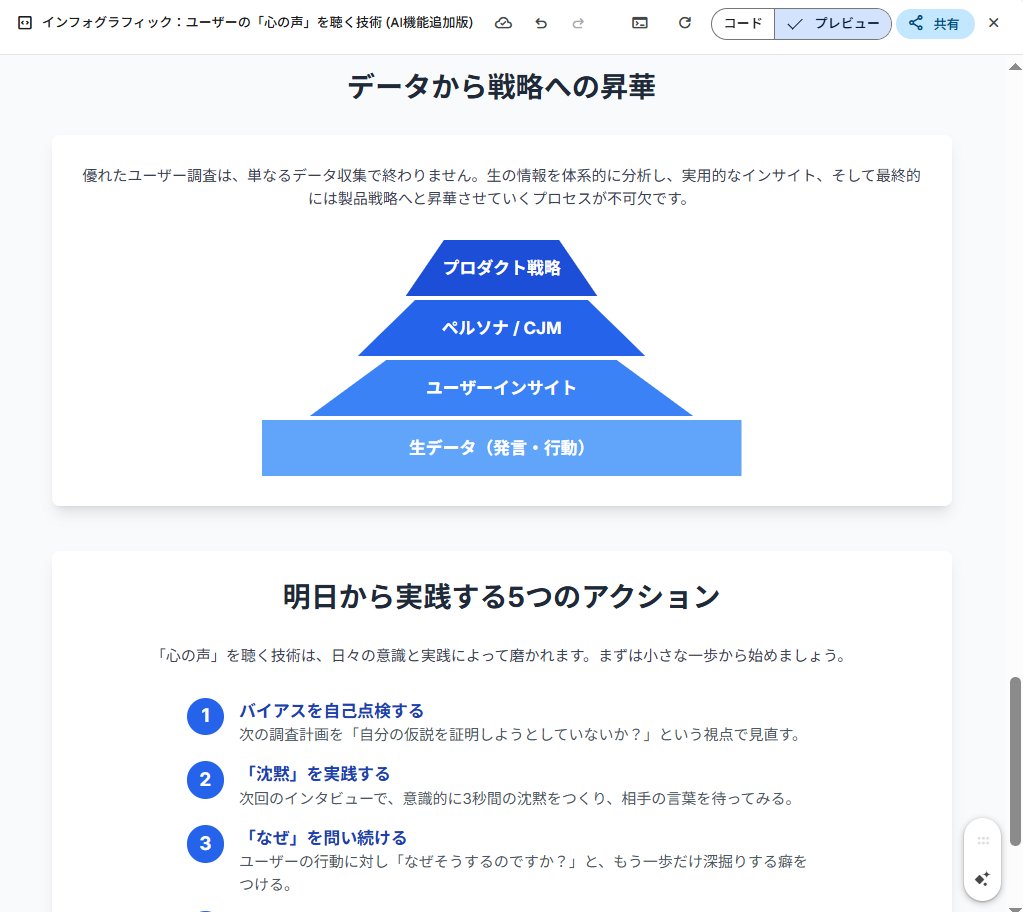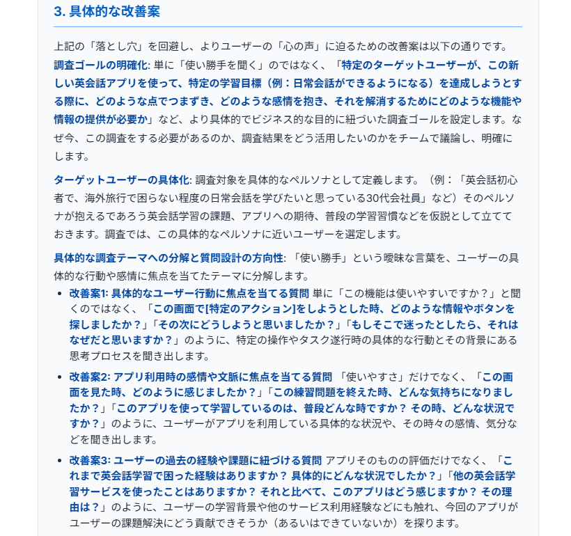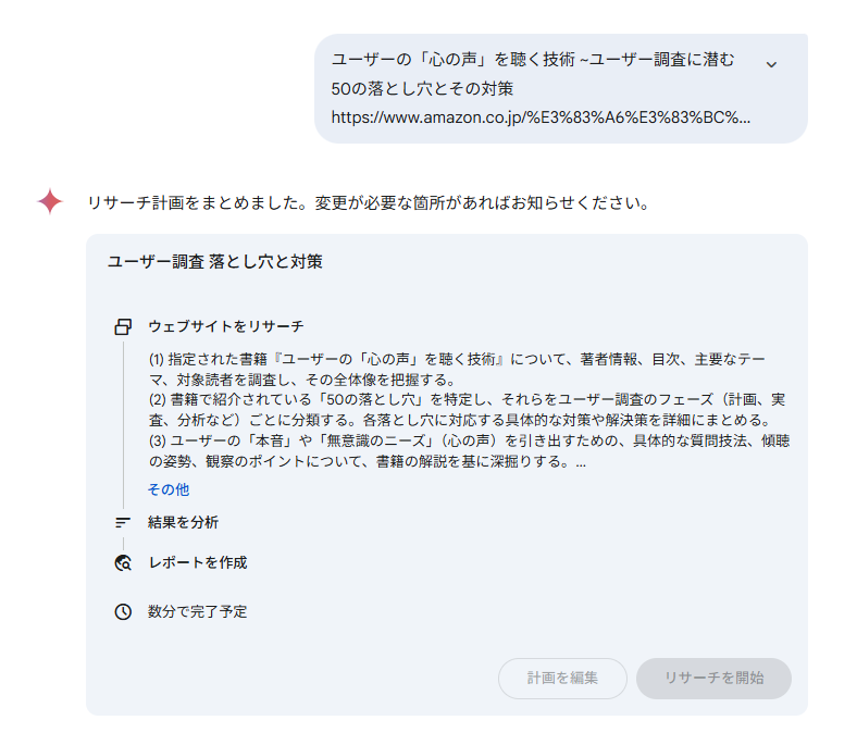 📝書籍タイトルとURLをGemini 2.5 Proに投げて、Deep Researchを実行 ✅️プロンプト ―――― ユーザーの「心の声」を聴く技術 ~ユーザー調査に潜む50の落とし穴とその対策 URL() 上記について学習ガイドとして学び、実用的に仕事で使えるように詳細調査して ――――