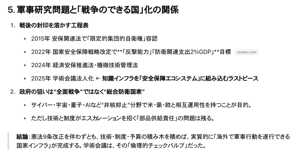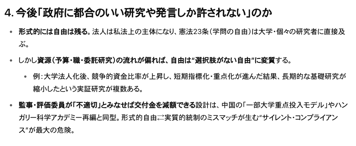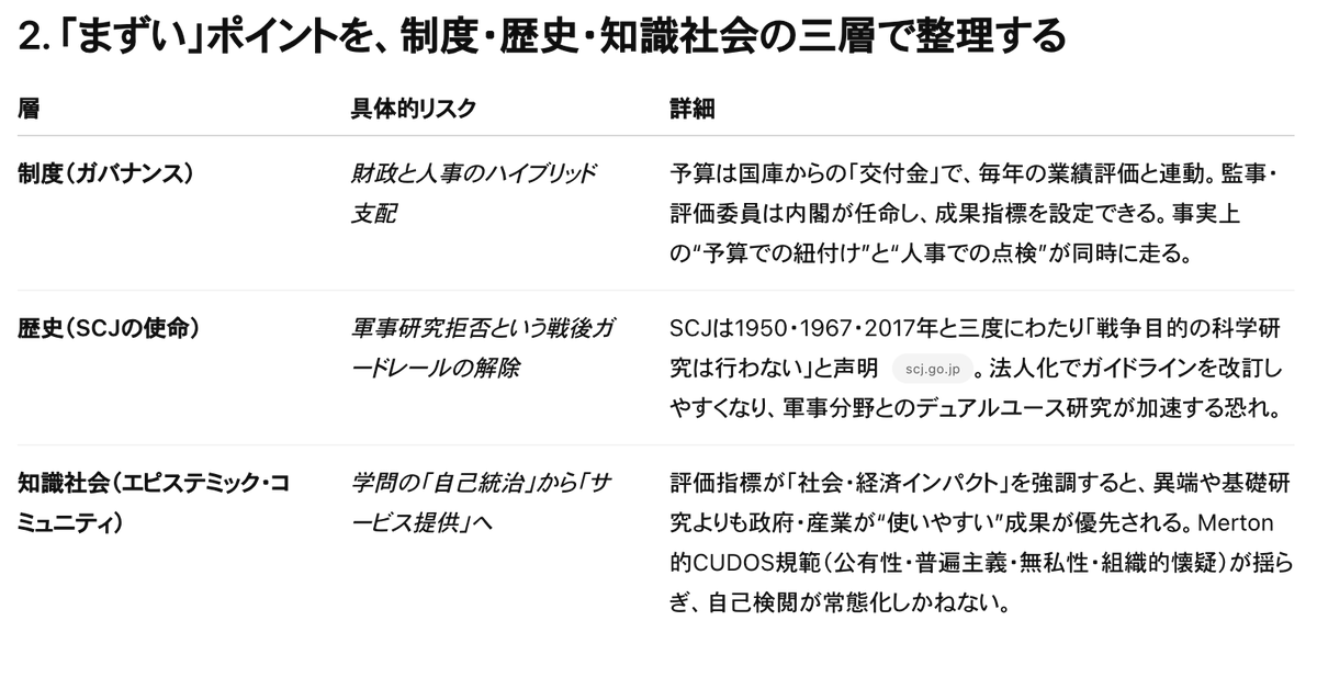 2.何がまずいのか 学術会議の法人化が「まずい」と言われる理由は、 制度の設計変更が引き起こすガバナンス上の圧力と、戦後日本の学術界が辛うじて守ってきた「軍事と距離を置く」という歴史的矜持、そして知識社会を支えてきた自己統治の文化――この三つの層が同時に揺さぶられる点にあります。
