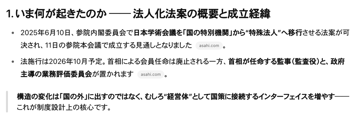 1. 何が起きたのか ── 法人化法案の概要と成立経緯 きょう六月十日正午すぎ、参議院内閣委員会は日本学術会議を「国の特別の機関」から切り離し、二〇二六年十月に“特殊法人”として再出発させる法案を賛成多数で可決しました。