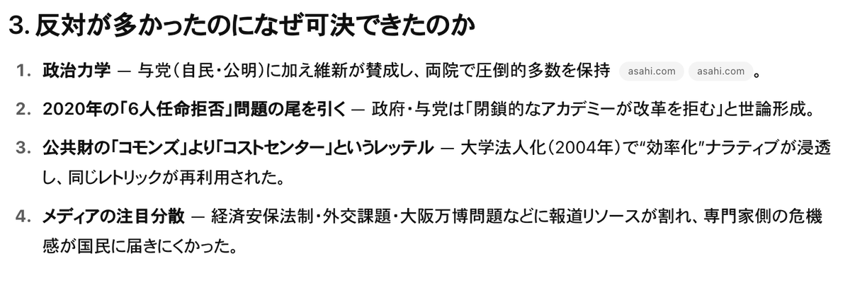 つまり今回の可決は、形式上は国の外に出して自由度を上げたように見えて、実質は評価・監査という二層構造で政府方針と連動する「接続端子」を増やした出来事です。 最初の数年で評価指標と資金配分ロジックをどう設定されるかが、学問の自律にとって試金石となるでしょう。