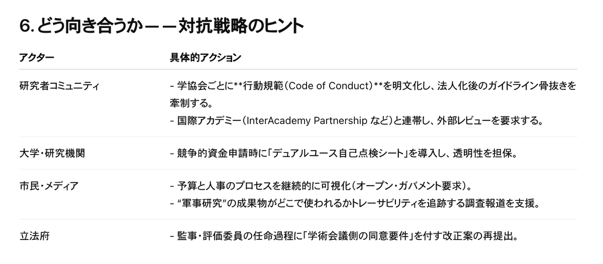 法人化で組織の憲章を書き換えやすくなれば、この「二度と軍事に協力しない」という防波堤が形式的には残っても、ガイドラインの改訂や解釈変更によって徐々に浸食される恐れがあります。