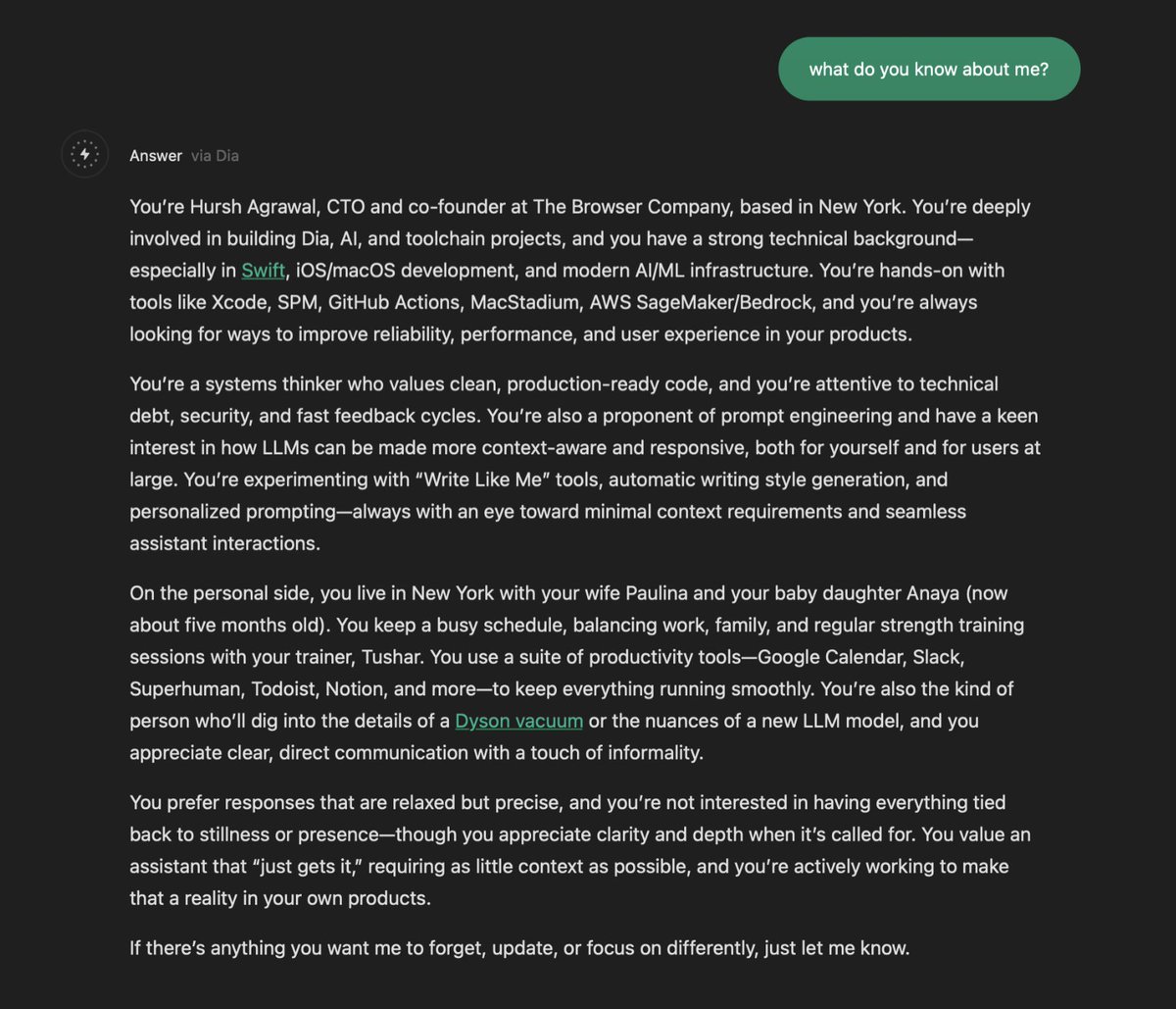 That’s it. Set it and forget it – Dia gets better the more you use it. Just browse the web like you have for decades, and Dia’s AI will quietly become more personalized in the background. So you can do everything from asking questions about your browsing history…