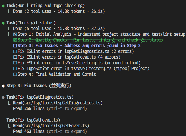 もうちょっと改善したらかなり良くなった。タスクをステップ分割して、ステップ内は並列実行してよい。タスクが終わるごとに現在のサブタスクを再考する。 これは Lint の結果を直接受けて修正するんじゃなくて、 Lint を並列に修正しようとしてるところ