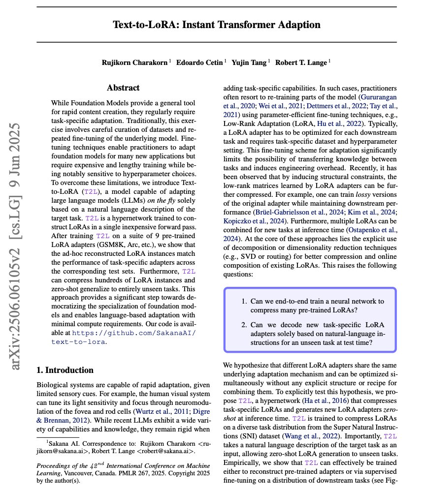 Paper Overview Introduces a hypernetwork-based approach, Text-to-LoRA (T2L), for instantly generating LoRA adapters from natural language task descriptions, removing the need for conventional task-specific fine-tuning.