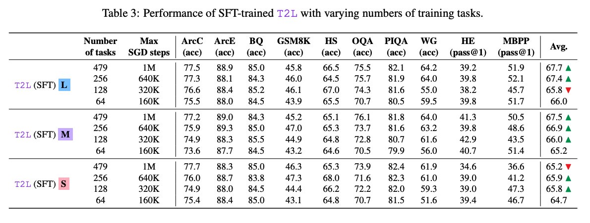 Variants The authors test three architectural variants (L, M, S) of increasing parameter efficiency. Ablations show that T2L scales well with the number of training tasks, and its performance is robust across different task description embeddings (e.g., from GTE or Mistral