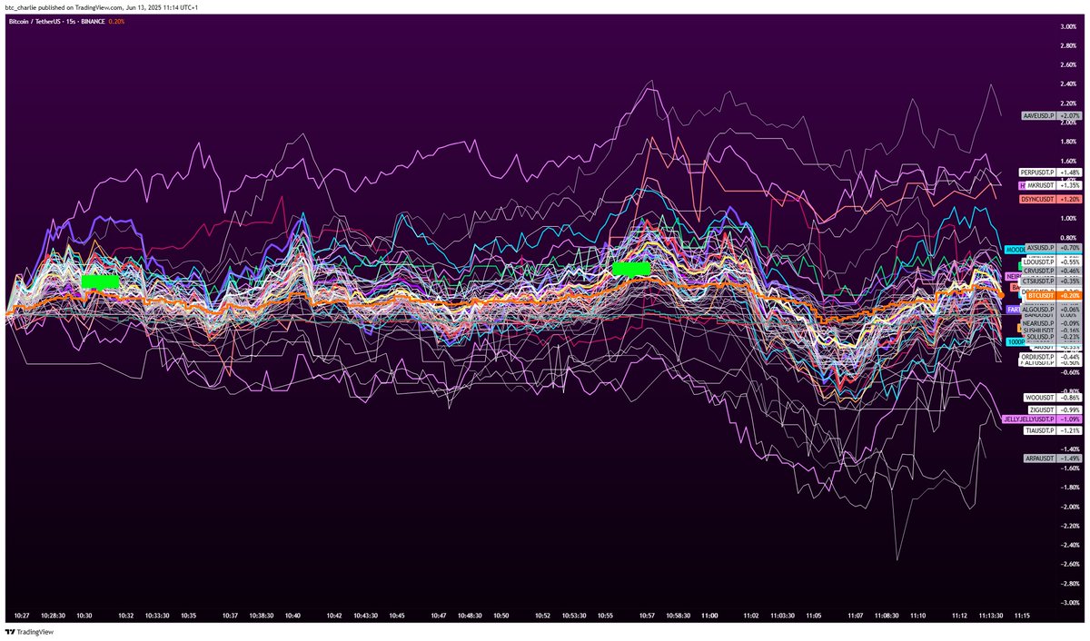 @btc_charlie I know you’re the OG of spaghetti charts sir Charlie but I would (if you don’t mind) like to share a little secret of how I use spaghetti.. I anchor my spaghetti from the candle right BEFORE the market moved lower. Often a range. I then wait to see what coin(s) is holding up