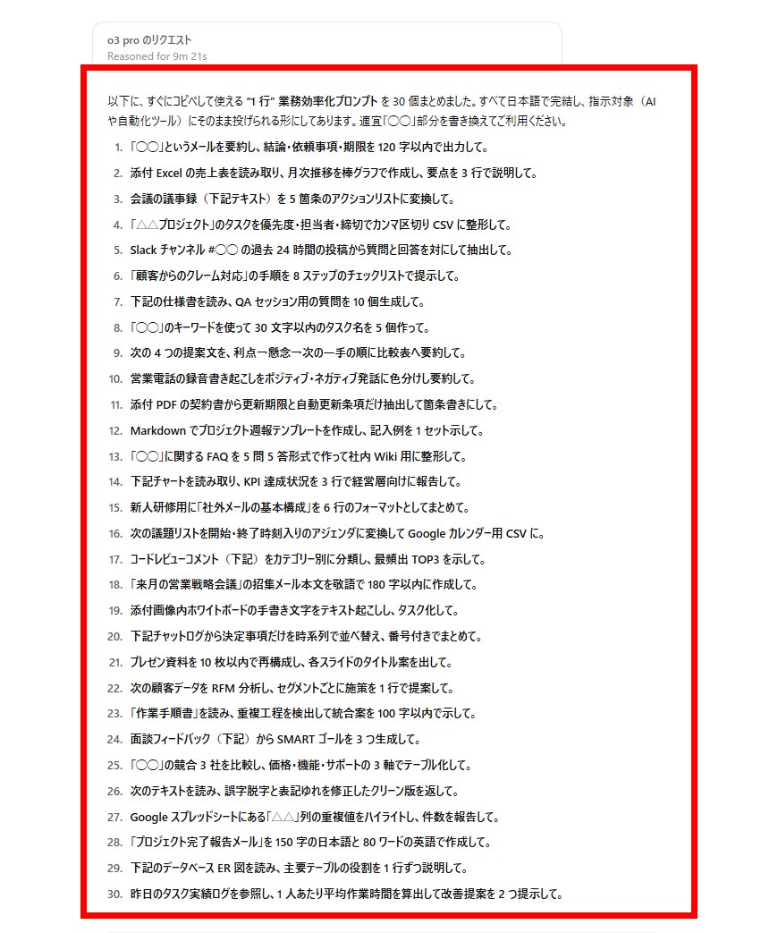 話題のo3-proに聞いた「業務効率化1行プロンプト30選」。 コピペですぐ使えるから、ブクマ忘れずに↓