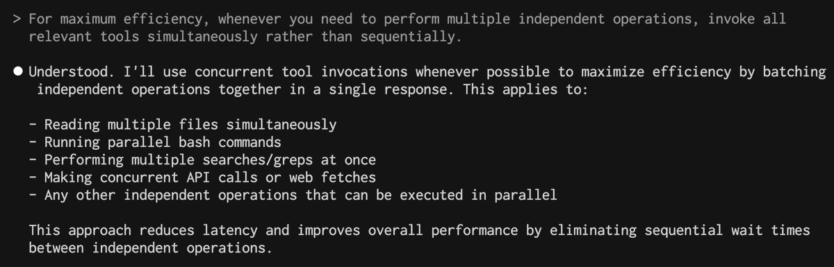 こちらのClaude Code並列実行のプロンプトを実行すると以下のように応答してくれます。 ーーーー 承知しました。可能な限り独立した処理をまとめて一度にツールを呼び出し、効率を最大化します。具体的には以下のようなケースに適用します: •複数ファイルの同時読み込み •並列での bash