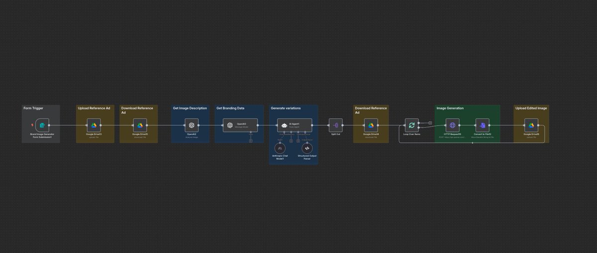 6 / Generate Endless Static Ad Variations here's a summary of the process: - just add brand info + a winning reference ad - agent writes 10+ prompt variations - generates new ad variations + uploads to Google Drive Resource link: https://drive.google.com/drive...