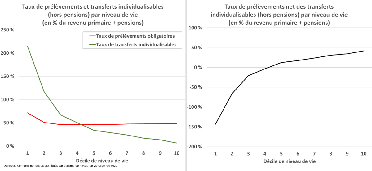 Les ménages les plus modestes paient-ils réellement 46 % de prélèvements obligatoires ? Quelle est la progressivité réelle du système fiscal ? Qu’en disent les comptes distribués de l’INSEE ? 1⃣ Prélévements et transferts monétaires en % des revenus primaires Ce 46 %