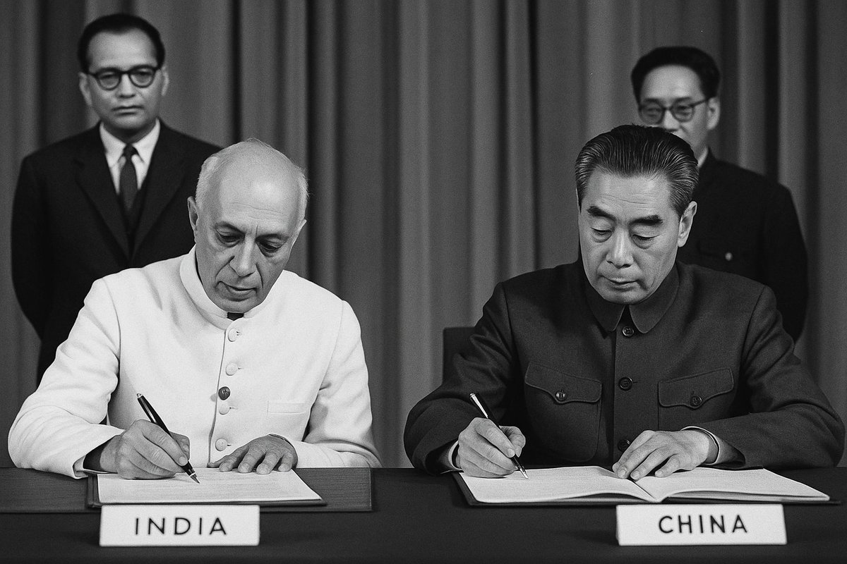 6/ In 1954, India signed the Panchsheel Agreement with China. This was the final nail in the coffin for Tibet. Bharat: Formally recognized Tibet as part of China Abandoned its own historical rights Silenced pro-Tibet voices internally Why? To appease Mao.