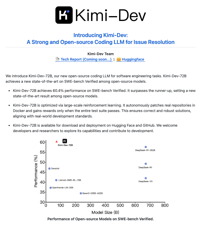 💻 Kimi-Dev-72BのGitHubリポジトリ。詳細な情報やコードはこちらで確認できます。 https://github.com/MoonshotAI/...