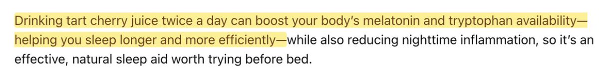 Sleep food #1: Tart cherries Contains natural melatonin AND tryptophan (which converts to melatonin). One study showed 84 extra minutes of sleep per night. Dosage: 1 ounce of tart cherry juice before bed or eat tart cherries twice daily: