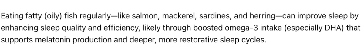 Sleep food #4: Fatty fish Salmon, tuna, and trout all naturally boost melatonin production. The omega-3 fatty acids optimize brain chemistry for deeper sleep cycles. Eat fatty fish 3-4 times per week for best results.