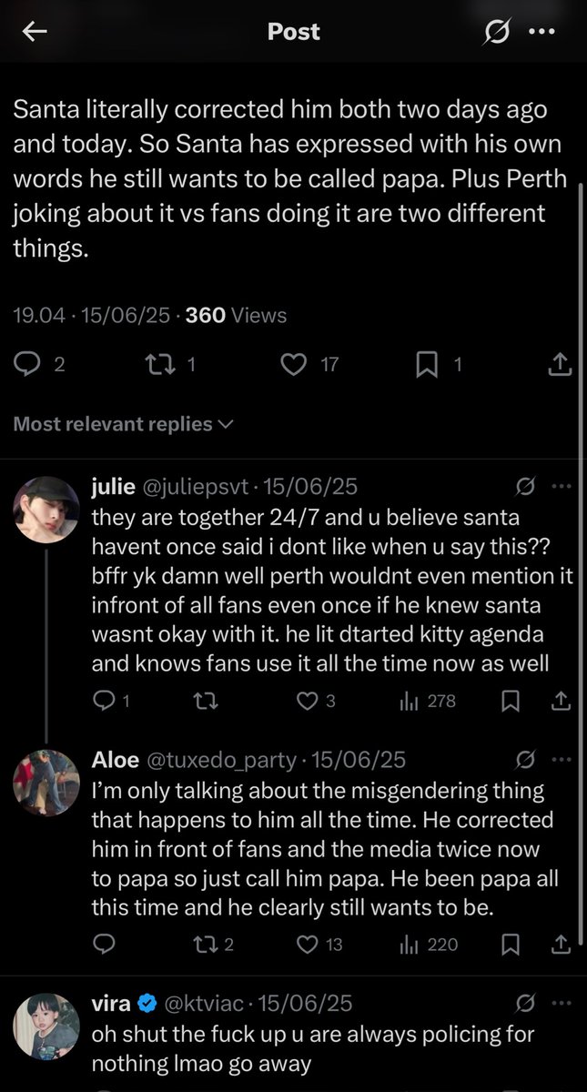 Misgendering actors calling them with female status, their defense statement is bcs S friend ever called him that too and he’s fine with it. The difference is that vira isn’t S friend. There is a line of boundaries between a fan and an artist. Misgendering is never okay.