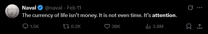 @naval said: "The currency of life isn’t money. It’s not even time. It’s attention.” It felt true. Attention is scarce. Precious. Fought over. But I couldn’t help asking… Is that the whole truth? Or just the beginning of it?
