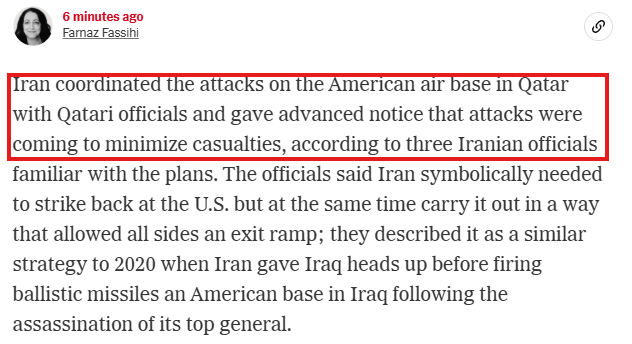 Here's where it gets even more interesting: The NYT reports that Iran COORDINATED the attacks on US bases with Qatari officials. This was to "minimize casualties" according to Iranian officials. Again, this is a way for ALL parties to appear "strong" in a de-escalatory way.